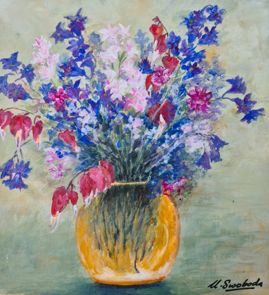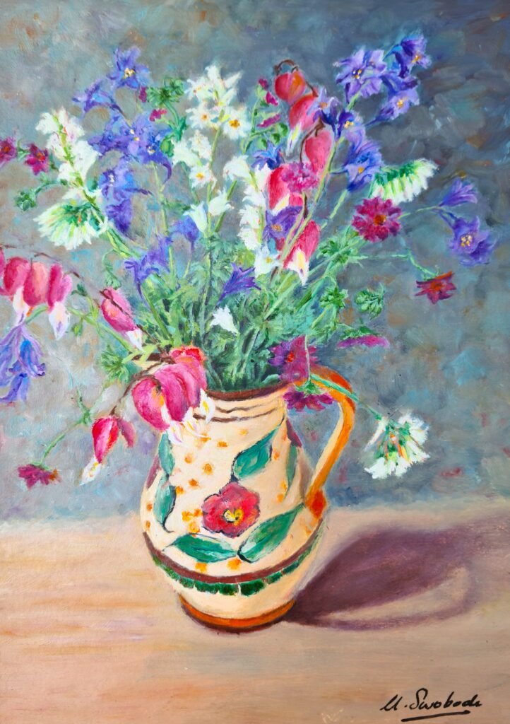 Spring Flowers in an Exotic Jug; Oil; 30cm x 39cm framed; £110